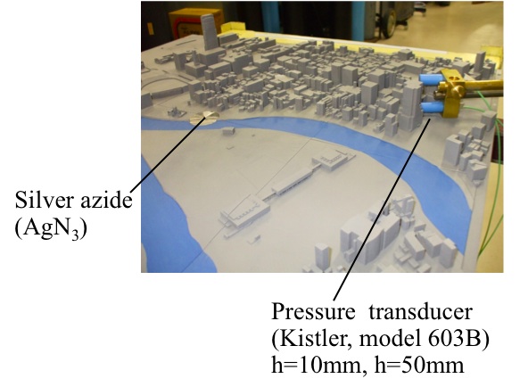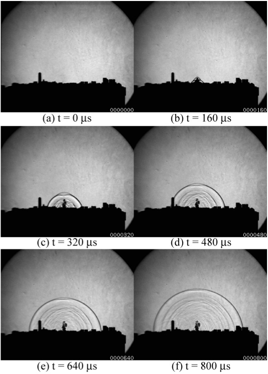 都市模型を用いて複雑な地形上を伝播する衝撃波挙動の大視野光学的可視化計測実験結果を示す。図2、3に都市模型(700mm×700mm)外観を示す。図4に複雑な模型上を伝播する衝撃波の高速度撮影結果を示す。各画像は、(a)模型なし、(b)都市模型の場合であり、画像は撮影速度16マイクロ秒/フレームで撮影し、160マイクロ秒間隔で表示してある。複雑な都市模型の地表面上で微小爆薬を起爆し発生した衝撃波が伝播し、模型上の構造物に干渉し、反射、回折等を起こして、先頭衝撃波背後では複雑に干渉した波が観察される。
