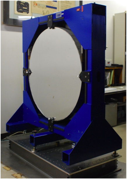 下図は、直径1m、焦点距離8mの大口径シュリーレン鏡であり、この大口径シュリーレン鏡1対を用いて、大視野光学可視化計測系を構築することが可能である。直径1m視野で撮影ができるため、様々な分野における光学可視化計測の適応が考えられる。実験例としては、複雑な地形模型上を伝播する衝撃波撮影1などがある。また、光学可視化計測と圧力計測の同時計測を行うこと等、他の計測手法を併用することで現象の把握が容易になります。