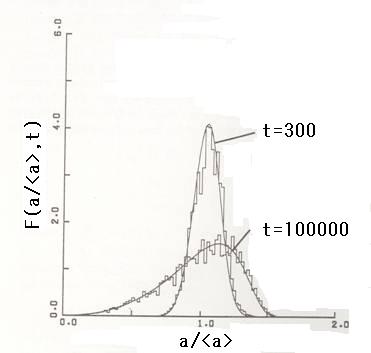 | In Fig. 2 the time evolution of the relative-droplet-size distribution function F(a/<a>,t) versus the relative droplet size a/<a> is shown at Q = 0.1 for different times t = 300 and 100000. The histogram indicates the simulation results and the solid lines the analytical results [2]. | ||||