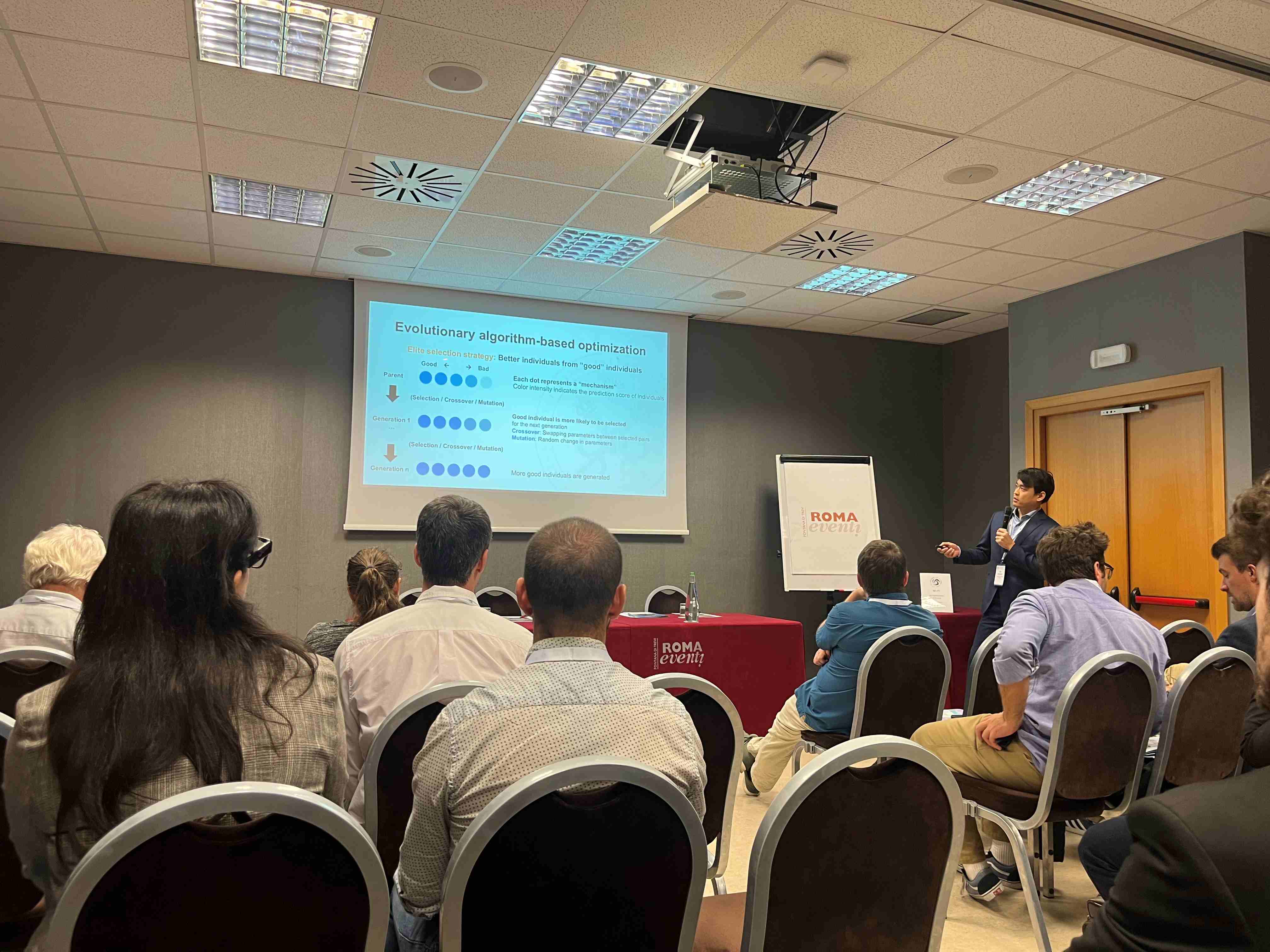 「数値燃焼」と聞くと一見かなり限定された研究分野のように思えますが、実際には非常に幅広い研究テーマが扱われており、その多様さに驚きました。 私は、最近取り組んでいる「天然ガス反応モデルの簡略化」に関する成果を発表し、有益な議論を行うことができました。また、燃焼研究におけるAIの活用や、液滴・噴霧・実在気体効果に関する計算上の課題など、興味深い最新研究についても学ぶことができました。会議期間中には、現在ベルギーで活躍されている当研究室OBの村上さんにもお会いしました。村上さんは独立成分分析を用いたモデル最適化の高度化について発表されており、私の研究テーマにも近い内容だったため、とても興味深く聞かせていただきました。